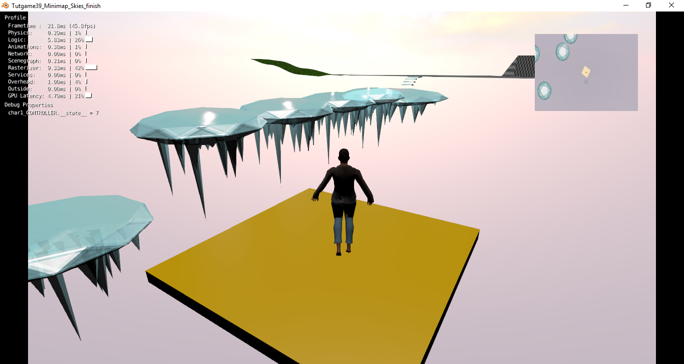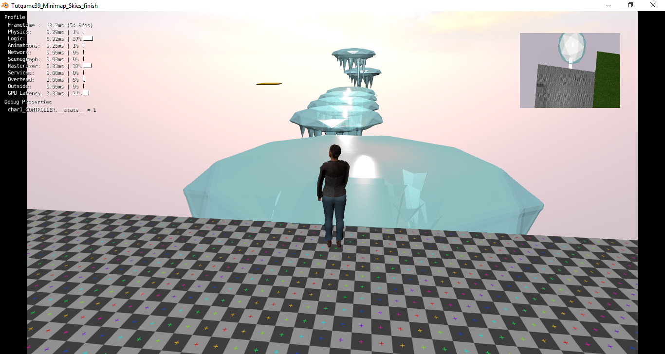Das Jump and Run bestand aus einigen selbst modellierten Eisplattformen, deren Kollisionen so konfiguriert waren, dass der Spieler nach wenigen Sekunden Stand langsam seitlich herunterrutschen würde.