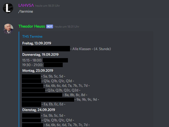 Außerdem kann der Bot die Termine unterteilt und formatiert ausgeben.